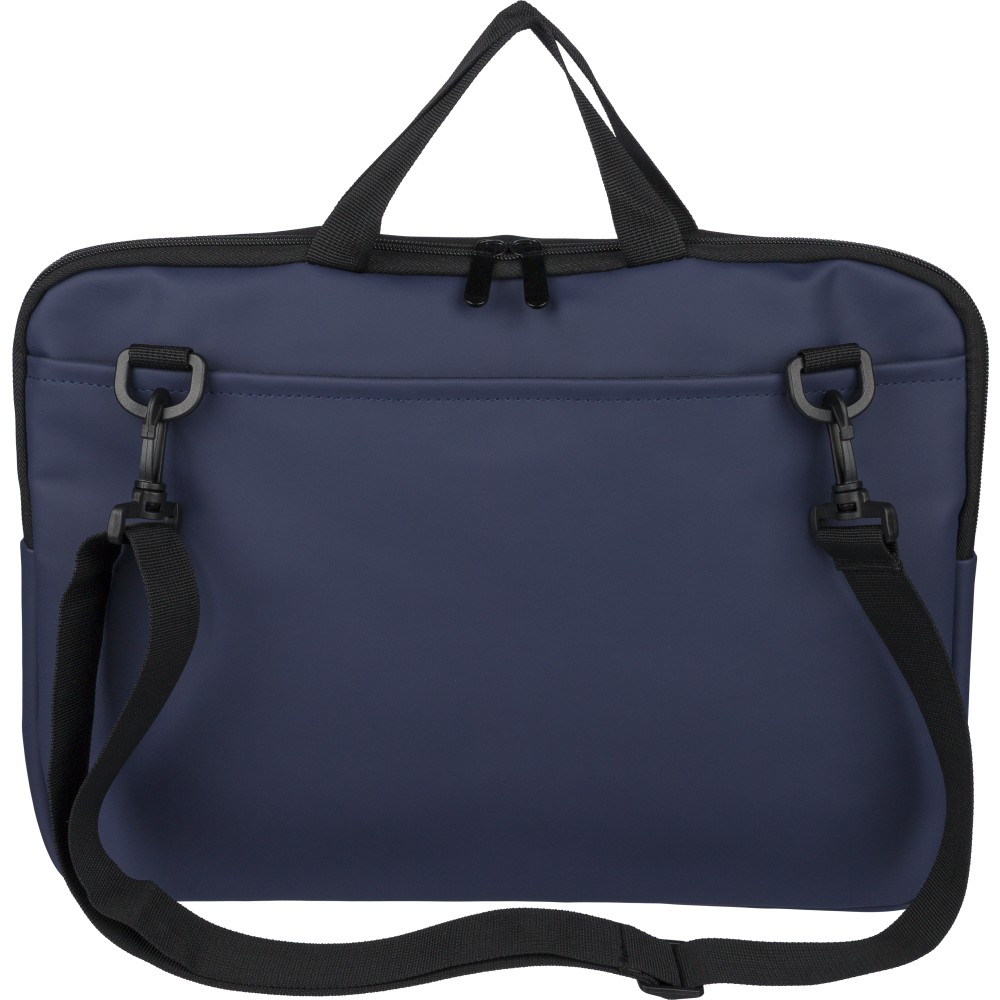 Újrahasznosított PU anyagból készült laptoptáska legfeljebb 15 hüvelykes készülékekhez, 4 mm vastag párnázással és 210D újrahasznosított béléssel. Elülső cipzáras zsebbel, hátoldali tépőzáras zsebbel, két rövid fogantyúval és állítható vállpánttal rendelkezik. A belső címkén újrahasznosított alapanyagra utaló logó található.