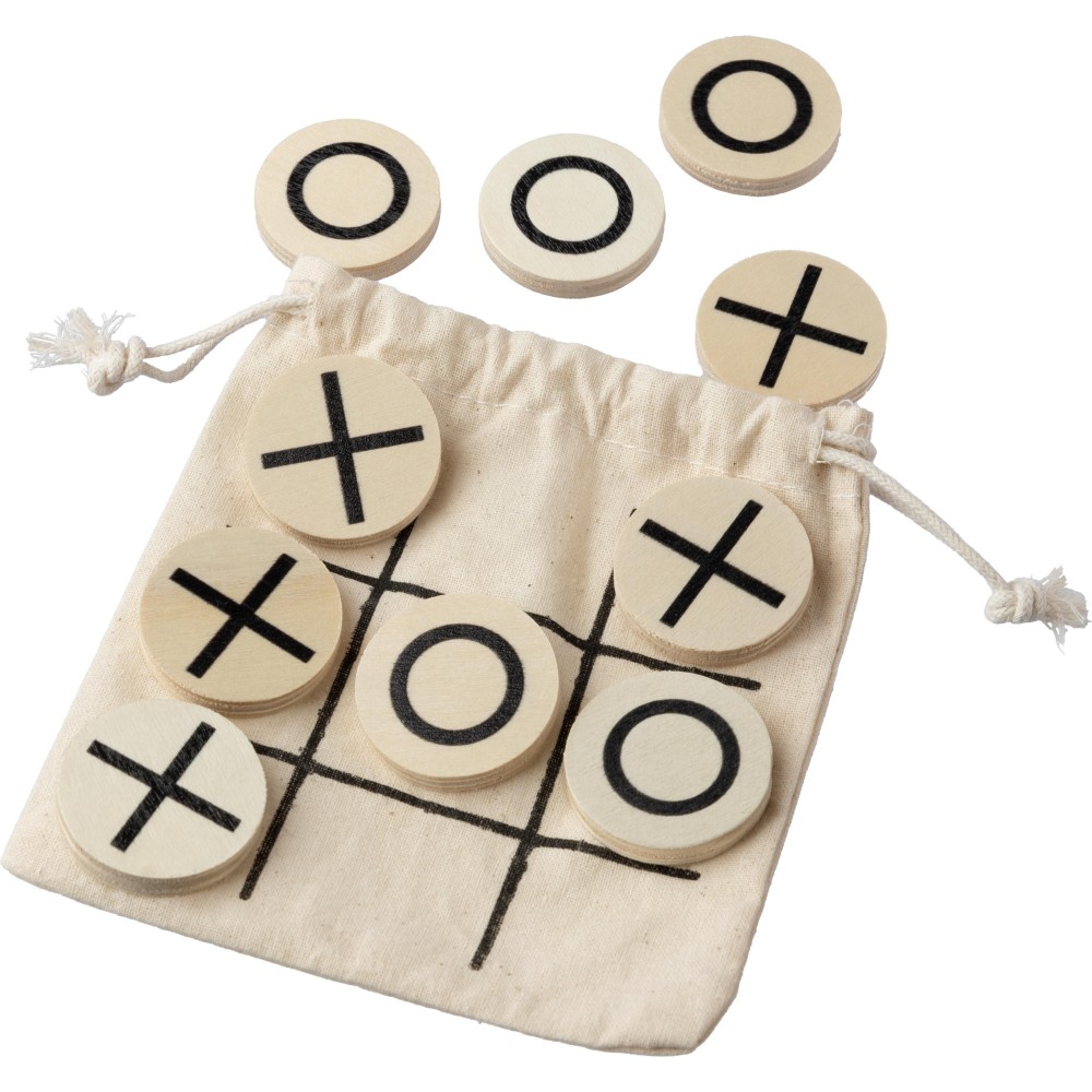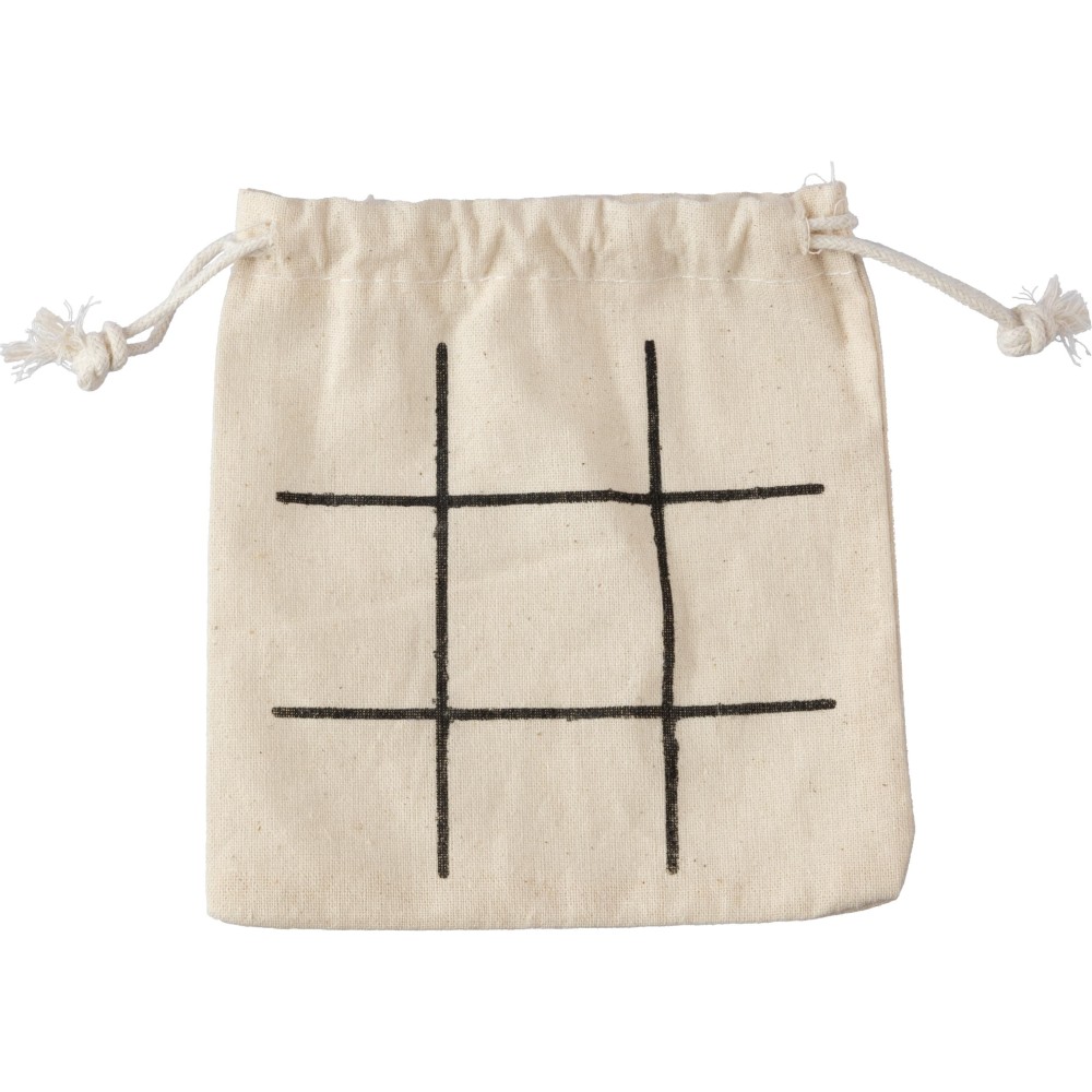 Natúr fából készült tic-tac-toe játék, 10 db elemmel, pamut tasakban.