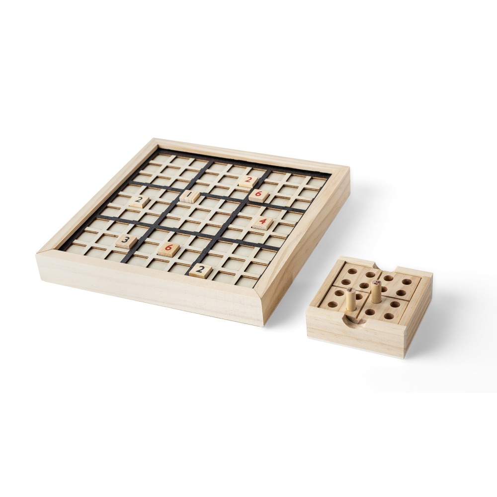 Fenyőfából készült mini Sudoku játék, felnyitható játéktáblával és belső tárolórekesszel 16 darab játéktüske számára. Kompakt kivitel, útközbeni használatra alkalmas. Darabonként barna kartondobozba csomagolva.