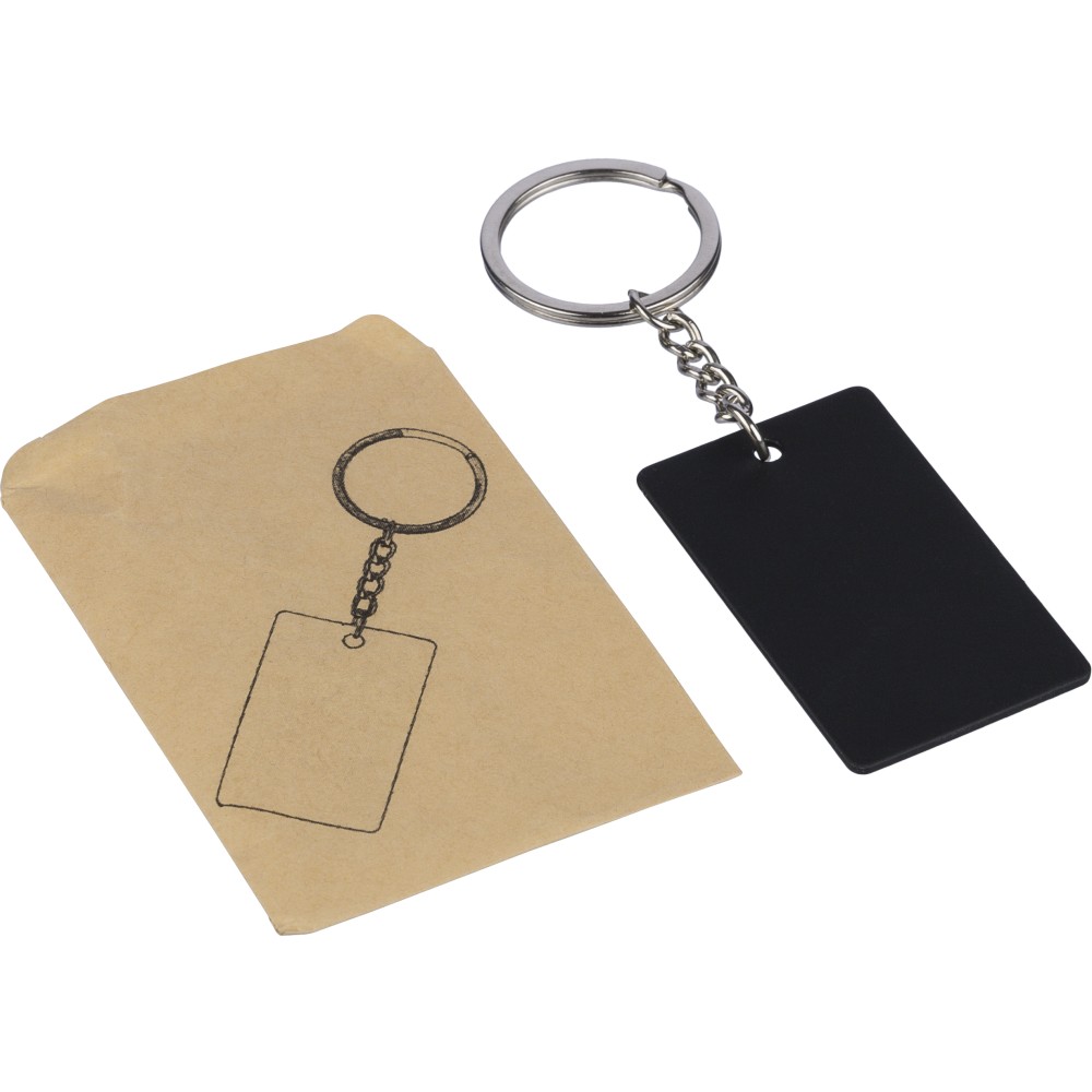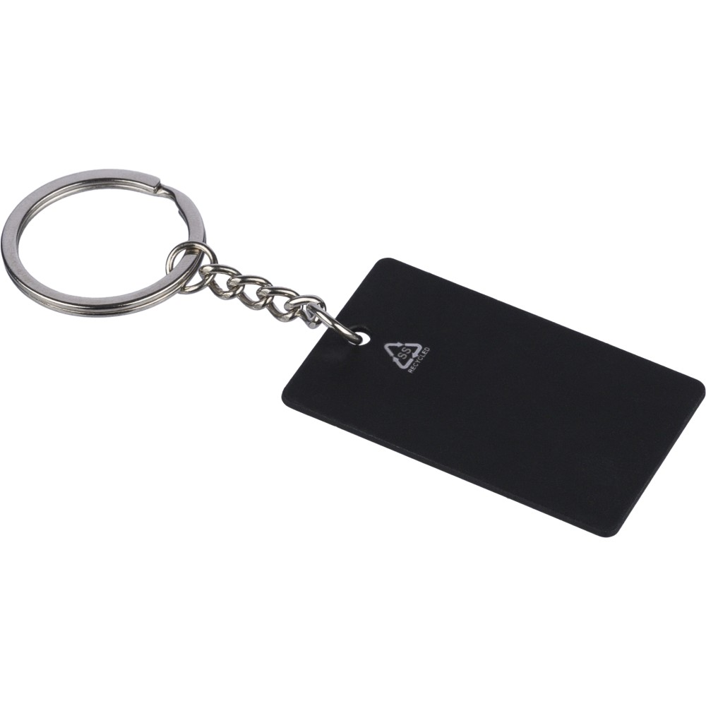 Újrahasznosított rozsdamentes acélból készült, gumírozott felületű, téglalap alakú kulcstartó fém karikával. A kulcstartón gravírozott recycled (újrahasznosított) alapanyagra utaló logó található, amely gravírozás után fényes, tükörszerű hatást mutat. Egyenként kraft papírtasakba csomagolva.
