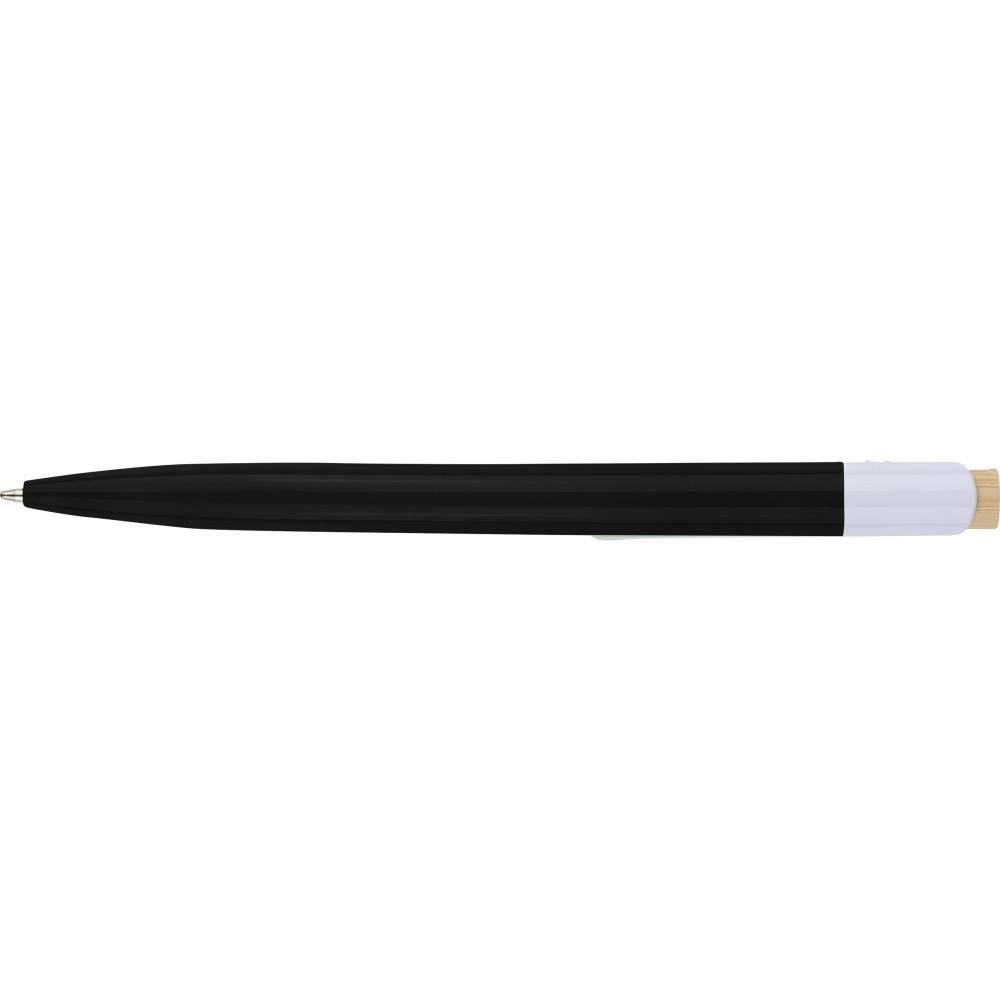 Újrahasznosított ABS-ből készült golyóstoll bambusz nyomógombbal és fehér klippel, digitális nyomtatásra alkalmas kivitelben. A tolltesten fröccsöntés során elhelyezett recycled (újrahasznosított) alapanyagra utaló logó található. Megközelítőleg 600 méter íráshosszúságú, kék színű tollbetéttel.