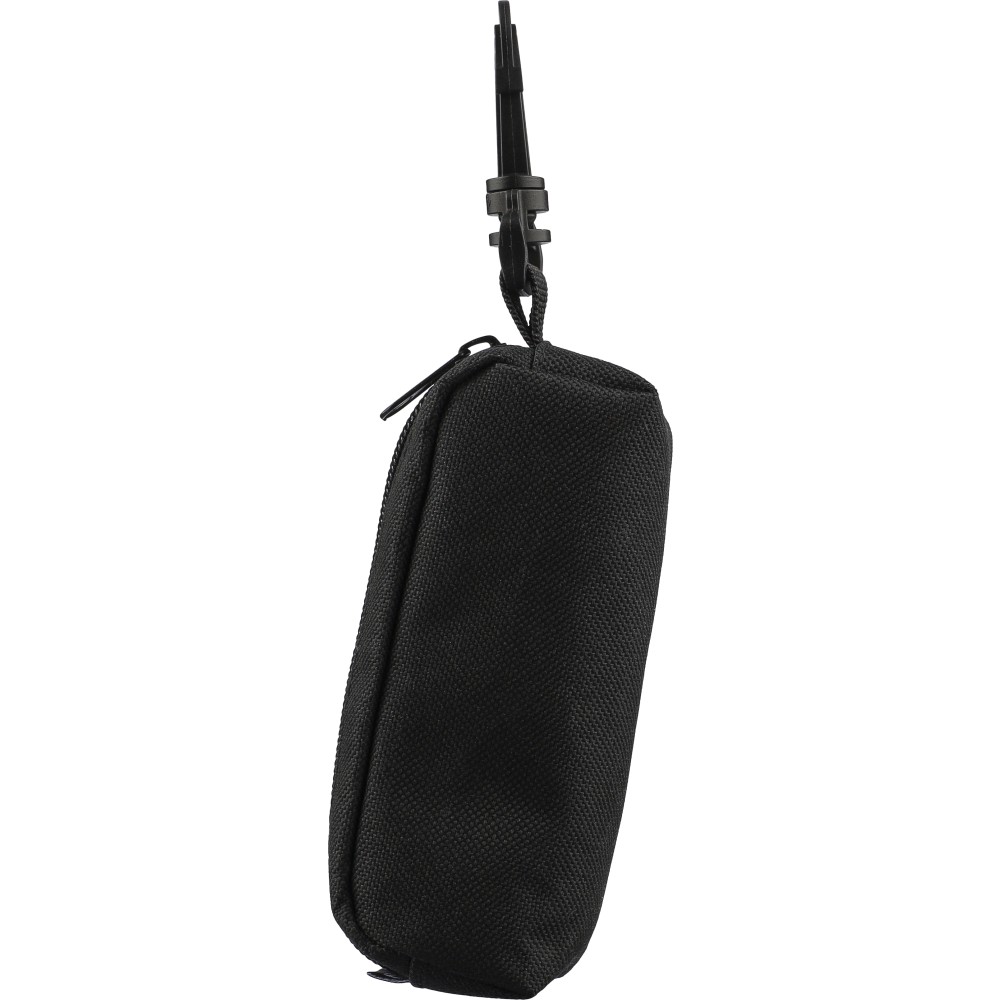 RPET anyagból készült, cipzáras tasakban elhelyezett golfkészlet PP karabinerrel, 3 gyakorló golflabdával és 3 darab bükkfából készült golftee-vel. A tasakon rPET címke található