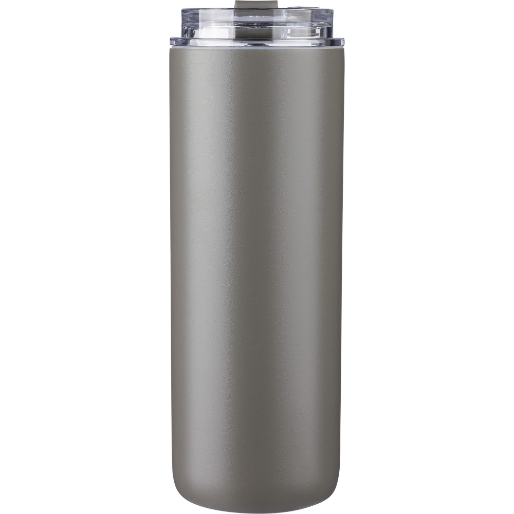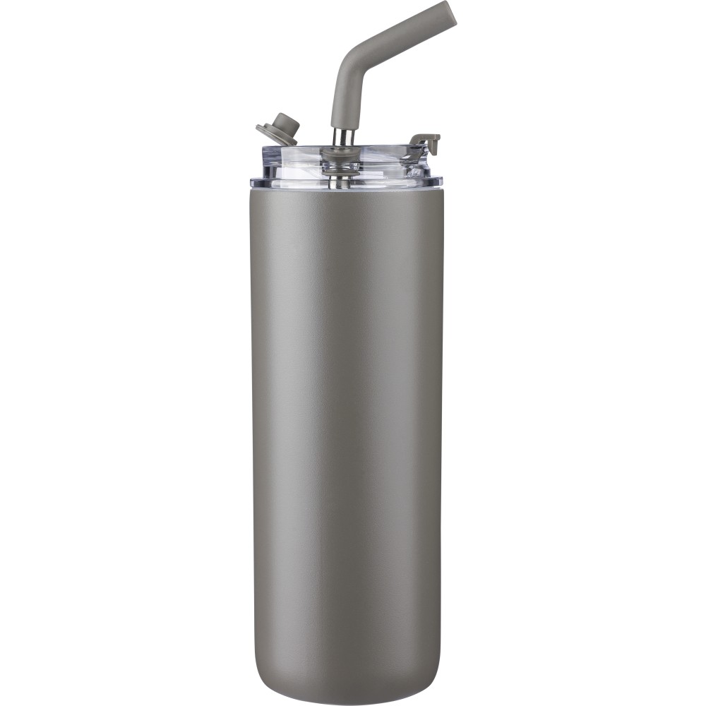 Duplafalú rozsdamentes acél kulacs (500 ml), belső anyaga 304-es rozsdamentes acél, külső része pedig 201-es rozsdamentes acél. Két tetővel szállítjuk: egy hordozófüles PP tetővel és egy átlátszó PS tetővel, amely a mellékelt rozsdamentes acél szívószállal, szilikon véggel és tartóval használható. Egyenként csomagolva, barna kartondobozban.